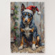 This gritty charcoal sketch captures the intense, focused gaze of the Blue Heeler, wearing a rugged Santa hat while sitting alertly near a rustic Christmas setting. A unique, textured design for ACD owners.