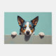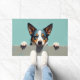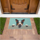 The dusty turquoise background adds a fresh and vibrant touch, perfect for welcoming entryways. Designed with extra space at the top and bottom, it allows easy personalisation with names, welcome messages, or custom text—making it ideal for unique dog-themed doormats and thoughtful gifts.