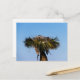 A beautiful blue heron bird sits in its nest on top of a palm tree against a beautiful blue cloudless sky in Florida
