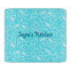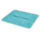 Aqua blue cutting board with hibiscus flowers pattern. Add a name to the centre, such as “Jayne’s kitchen”, or remove the text to order blank. The floral design is made up of outlines in white over a pretty blue background, which you may change. Text is dark blue.
