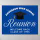 A classic custom class reunion party welcome poster for alumnus in blue and white typography for a high school, college, or university. Customise with your school name and graduating class for great personalised alumni celebration decor.