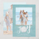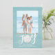 This design features a Christmas photo card with a 2 two photo, a fun cute beach, a simple minimalist tropical, brush script typography design, with a turquoise blue watercolor, with joy lettering, at the beach, a tropical Florida holiday photo card