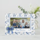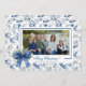 A traditional blue floral pattern of holly and leaves with a grandmillenial, toile flair to showcase your holiday photos! This holiday photo card features one photo on the front side with a blue toile bow. You can add your choice of Greeting - Merry Christmas, Happy Holidays, etc. along with a line for names or a longer greeting. The back has the same background with room for 5 photos and a decorated evergreen plant in a blue and white pot decorated with blue toile ornaments, under which you can put the year.