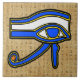 Ceramic tile with the Ancient Egyptian symbol, the Horus eye on Hieroglyphs. This design features the Horus Eye in blue, yellow and black outlines on top of a Hieroglyphs background.