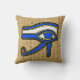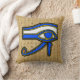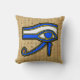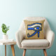 Throw pillow with the Ancient Egyptian symbol, the Horus eye on Hieroglyphs. This design features the Horus Eye in blue, yellow and black outlines on top of a Hieroglyphs background.