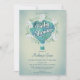 A beautiful blue and turquoise floral boys baby shower invitation featuring a hot air balloon accented by a wreath of white roses on a blue and yellow background.