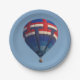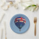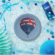 A red, white and blue hot air balloon soars in the clear blue sky.