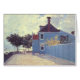 The Blue House at Zaandam (1871) by Claude Monet is a vintage impressionism fine art painting featuring a blue house. A family is walking down the street near the homes in a quiet neighbourhood. The home was a fence and is on a tree lined street on a cloudy day in the Netherlands.