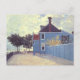 The Blue House at Zaandam (1871) by Claude Monet is a vintage impressionism fine art painting featuring a blue house. A family is walking down the street near the homes in a quiet neighbourhood. The home was a fence and is on a tree lined street on a cloudy day in the Netherlands.