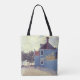 The Blue House at Zaandam (1871) by Claude Monet is a vintage impressionism fine art painting featuring a blue house. A family is walking down the street near the homes in a quiet neighbourhood. The home was a fence and is on a tree lined street on a cloudy day in the Netherlands.