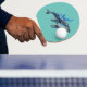 traditional watercolor artwork of a big blue coloured humpback whale on a ping pong paddle