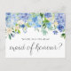 This maid of honour proposal card features a watercolor floral garland with blue hydrangeas, ivory roses, and greenery accents. This hydrangea maid of honour card is perfect for garden weddings, spring or summer ceremonies, and classic bridal themes. It’s an easy and meaningful way to ask someone special to stand by your side on your big day. Add a name and message to create a personal touch she'll remember. Whether you're asking your sister, best friend, or cousin, this card brings a beautiful moment to your wedding planning journey.