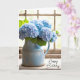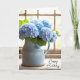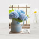 Pretty blue hydrangea bouquet in a vintage base by a rustic farmhouse window for birthday.