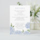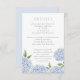 This beautiful blue hydrangea floral wedding enclosure card features watercolor blue flowers and your custom text. The reverse is a thin watercolor stripe, which can be deleted for a solid colour back. Use the template to fill in your information. The "Customise further" feature can be used to change the font (size, style, colour), and add more lines of text, change the layout and add text to the back.