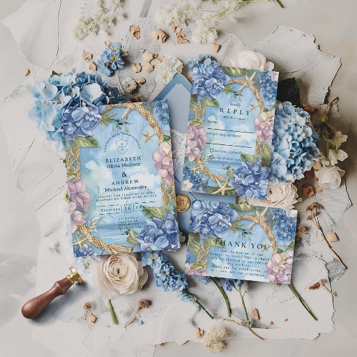 Blue Hydrangea Coastal Rope Wedding Invitation