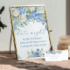 Elegant and feminine "something blue before I do" bridal shower design with watercolor-painted floral arrangements of blue hydrangea flowers, greenery, and white roses.