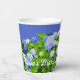 Bridal shower floral paper cups with blue hydrangea flowers. Green shrubs full of beautiful blue blooms wrap around paper cups to use at a bridal shower, birthday party, or any event with a garden theme. Include text along the bottom such as, "Alyssa's bridal shower", or remove wording to buy blank.