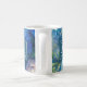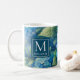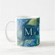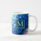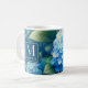 Blue hydrangea botanical art mug with customisable name and monogram templates.