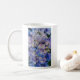 A white coffee mug featuring my coloured pencil artwork of blue hydrangeas