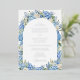 This elegant watercolor floral wedding design features an arch frame of blue hydrangea flowers, white roses, forget-me-not flowers, and lush greenery. Inspired by a classic English garden.