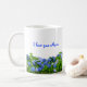 I love you Mum blue hydrangeas mug. Hydrangea bushes / shrubs growing in the garden is the image along the bottom with blue wording on both sides.