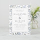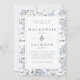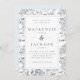 A pretty and elegant wedding invitation featuring a watercolor floral pattern background of blue hydrangeas and leaves on a white background, overlaid with a double rectangle frame. Wedding details are in slate blue charcoal serif font. The reverse is in solid light blue.