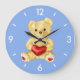Customisable teddy bear clock with a cute teddy bear holding a red heart and hypnotising you with its unblinking gaze, on soft blue background. This lovely huggable teddy bear kids clock would be a great gift for kids or someone you love.