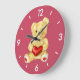 Customizable teddy bear clock with a cute teddy bear holding a red heart and hypnotizing you with its unblinking gaze, on soft blue background. This lovely huggable teddy bear kids clock would be a great gift for girl or someone you love.
