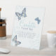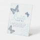 Blue and white hand inked butterflies wedding confetti take me sign. Simple leaf graphic background design with butterflies swallowtail, painted lady and fritillary. Personalise with your own words, currently reads Confetti Take Me So when the newly weds walk your way you can throw this confetti and shout. Hooray! Ideal to use for guests to take a particular type of confetti so you get the confetti all looking the same or is suitable if your venue has environmental restrictions and only allows leaves or real petals to be used that you have to get approved. Other colours and matching items available. © Original ink drawing and graphic design by Sarah Trett for www.mylittleedenweddings.com on zazzle.