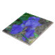 A close up photograph of a beautiful blue iris flower printed on a ceramic tile.