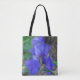 A close up photograph of a beautiful blue iris flower printed on both sides of a tote bag.