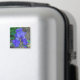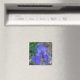 A close up photograph of a beautiful blue iris flower printed on a square fridge magnet.