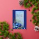 Lovely dark blue wedding invitation with a lighter blue text area and graphics of a large blue iris, on the bottom. Personalise the foil text for your wedding celebration.