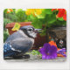 This colourful mousepad features a blue jay who has landed on a porch deck surrounded by flowers. The blue, grey, white and black coloration of the bird is set off by a riot of colour. There is a decorative teapot with orange and yellow nasturtiums and a purple petunia. Green leaves complete this kaleidoscope of colours.