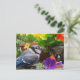 This colourful postcard features a blue jay who has landed on a porch deck surrounded by flowers. The blue, grey, white and black coloration of the bird is set off by a riot of colour. There is a decorative teapot with orange and yellow nasturtiums and a purple petunia. Green leaves complete this kaleidoscope of colours.