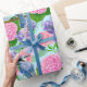 Watercolor pattern made of a blue jay and various flowers- hydrangea, peony, and anemone.