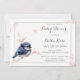 Baby shower invitation features baby blue jay perching on a branch. Click customise further to change font style, size or colour.