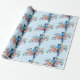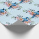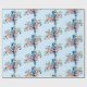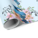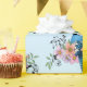 A blue jay bird surrounded by pink, purple and peach pastel coloured spring flowers set against a light blue backdrop.
