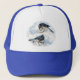 This hat is decorated with two colourful Blue Jays scratching in the snow for something to eat. Blue shadows form a lovely pattern in the background.