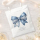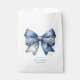 Introducing adorable favour bags for a delightful baby shower that embodies the essence of country charm! This enchanting design showcases a whimsical blue jean print coquette bow, adorned with exquisite pearl and lace detailing that adds a touch of elegance. The beautiful contrast against the soft white background creates a striking visual appeal.
