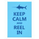 Keep Calm and Reel In! A fishing parody in blue and white of the classic WWII poster. This fishing parody makes a great Father's Day gift for dad. The funny graphic and text design features the shape of a swordfish. Enjoy saltwater fishing? This swordfish design makes a great custom souvenir for Florida sports and commercial fisherman, charter boat captains, and tourists.