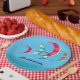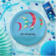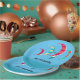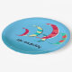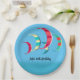 Summery blue kite surfing theme paper plates with customisable text. Brightly coloured kites in reds, blues, yellows and green adorn the plates.