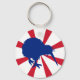 The blue shape of a kiwi bird silhouetted against a red and white design. A design using the colours of New Zealand's flag.