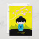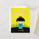 Blue kokeshi postcard - with serenity kanji and cherry blossom on light green background