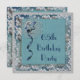 Elegant personalised / personalised custom 65th birthday party celebration invitations for women and girls. On the front of these glamourous birthday party invites is a printed image of blue lace with a pretty white doily mat with a blue flower and silver leaf and a trailing blue ribbon. Behind the blue lace is a small border of silver leafs and a larger border of trendy glitz glam border of bling rhinestones jewels diamonds, all printed on a soft silvery background. The reverse of this female birthday card has the same images but without the silvery background. These glamourous, elegant, stylish, sophisticated, girlie invites are decorated / printed on both sides. All text is fully customisable to meet your requirements, if you need any assistance in customising your product please contact me through my store and i will be very happy to help you.