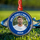 This cool customized high school lacrosse player photo gift features white typography of your team and player name on a Christmas ornament with a ball and rackets icon on a blue background. Personalize with your athlete's photograph and class year as a proud sports parent.