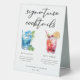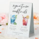 This chic coastal signature cocktails menu table tent sign features simple black typography above 2 seaside drinks and their ingredients for your beach wedding bar. A cute Blue Lagoon and Dirty Shirley or cherry drink drawing add a cool flair to your bar menu. Complete with the couple's names and date for their reception.