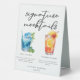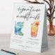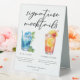 This cool pool party or beach wedding signature mocktails table tent sign features simple script above 2 drawings of drinks and their ingredients for your tropical island celebration. A cute non-alcoholic Blue Lagoon and Summer Sunrise drink for a refreshing poolside or ocean reception in the summer. Complete with the couple's names and date.
