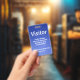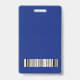 Vertical Visitor's Pass badge in blue leather gradient design. All elements are changable or removable. Elements include: Visitor (can say "guest" or "pass" or any word, the phrase "Visitor Badge Must Be Returned Before Exiting the Building, company name, company department, Security barcode scan is on the back and can be changed or removed. Slot at top for lanyard, but you can choose another option, such as a metal clip or retractable strap.