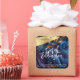 The rich blue pattern of plant leaves is complemented by golden elements.